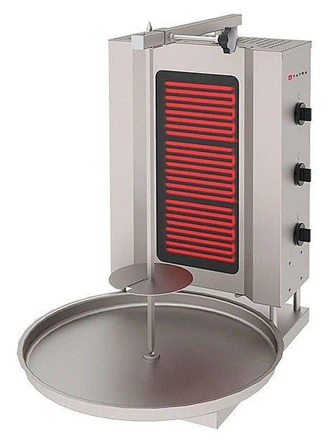 Гриль для шаурмы Tatra? TDM E 3M предназначен для обжарки большого количества различных видов мяса и птицы при приготовлении начинки из рубленного мяса для шаурмы и других блюд на предприятиях общественного питания и торговли. Модель оснащена электромеханической панелью управления и емкостью для сбора жира. Корпус выполнен из нержавеющей стали.