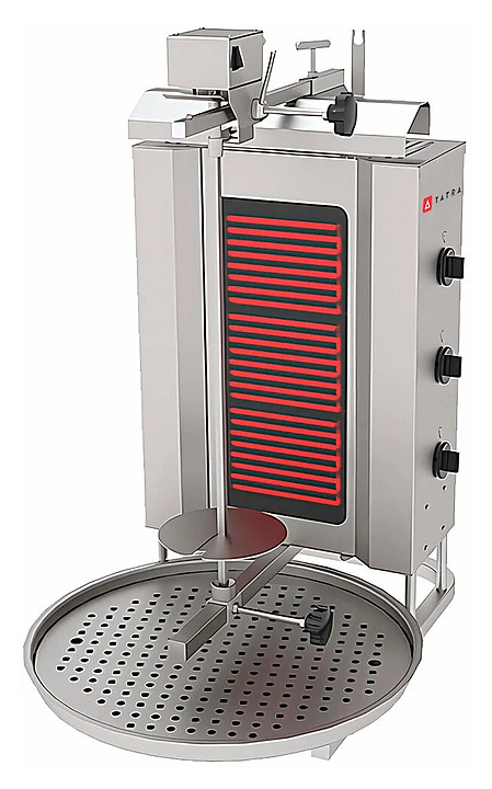 Гриль для шаурмы Tatra? TDM E 3T предназначен для обжарки большого количества различных видов мяса и птицы при приготовлении начинки из рубленного мяса для шаурмы и других блюд на предприятиях общественного питания и торговли. Модель оснащена электромеханической панелью управления, верхним приводом вращения вертела и емкостью для сбора жира. Корпус выполнен из нержавеющей стали.