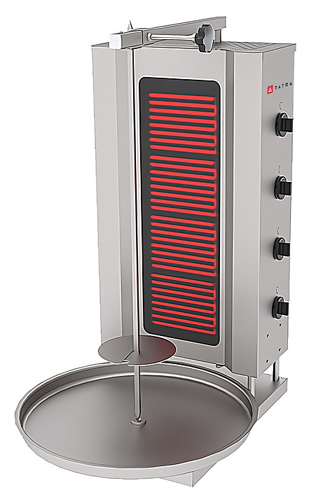 Гриль для шаурмы Tatra? TDM E 4B предназначен для обжарки большого количества различных видов мяса и птицы при приготовлении начинки из рубленного мяса для шаурмы и других блюд на предприятиях общественного питания и торговли. Модель оснащена электромеханической панелью управления. Корпус выполнен из нержавеющей стали.
