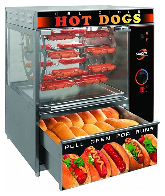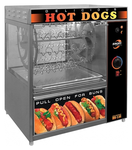 Компактный карусельный гриль с люлечным вертелом Sikom МК-1.44М предназначен для приготовления хот-догов в заведениях быстрого питания, супермаркетах и уличной торговли. Модель оснащена подогреваемым ящиком для булочек, подсветкой и поддоном. Корпус выполнен из нержавеющей стали, дверца и 2 стенки - из стекла.