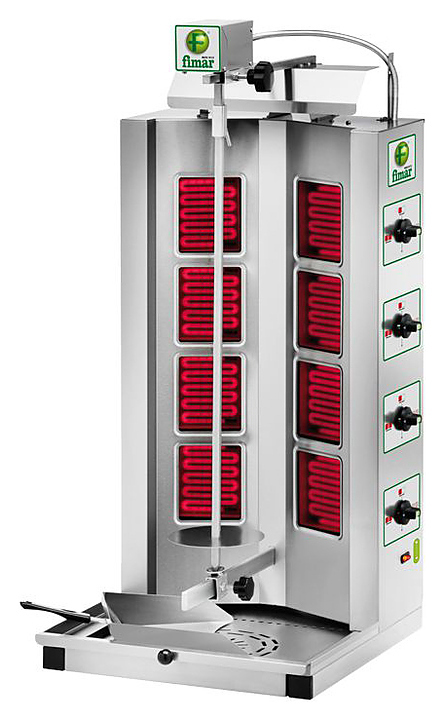 Гриль для шаурмы FIMAR GYR 80 используется на предприятиях общественного питания и торговли для приготовления мясной начинки. Модель оснащена 3 уровнями мощности, инфракрасными ТЭНами с керамическим покрытием и жаростойким защитным стеклом. Корпус, шампур, лопатка и поддон для сбора отходов выполнены из нержавеющей стали.