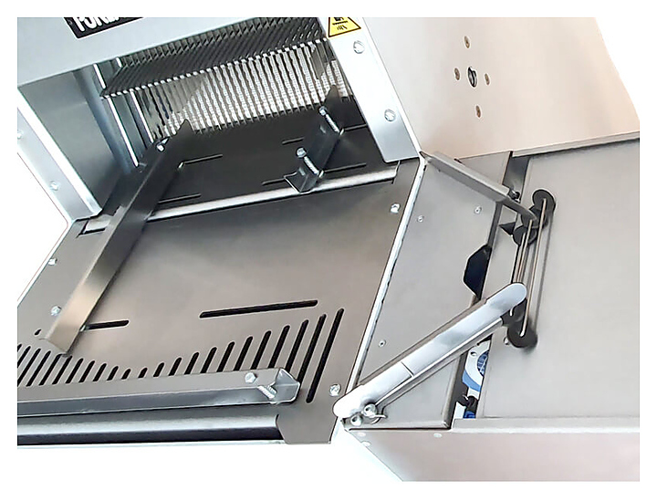 - Благодаря второй ленте сверху, батоны хлеба не накладываются друг на друга в процессе резки, при этом высота нарезаемого хлеба регулируется в зависимости от размеров хлеба