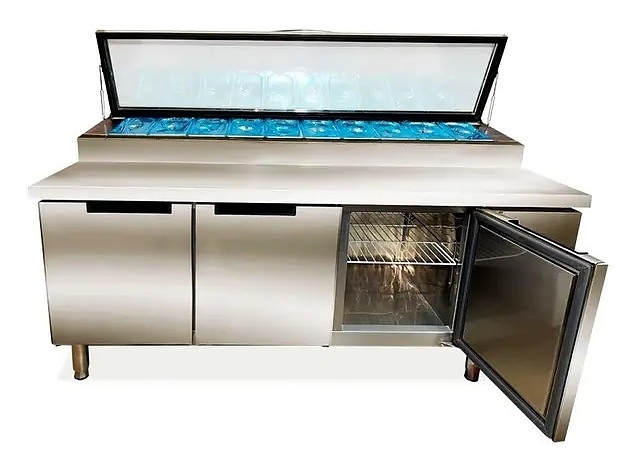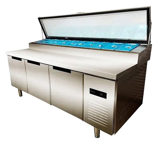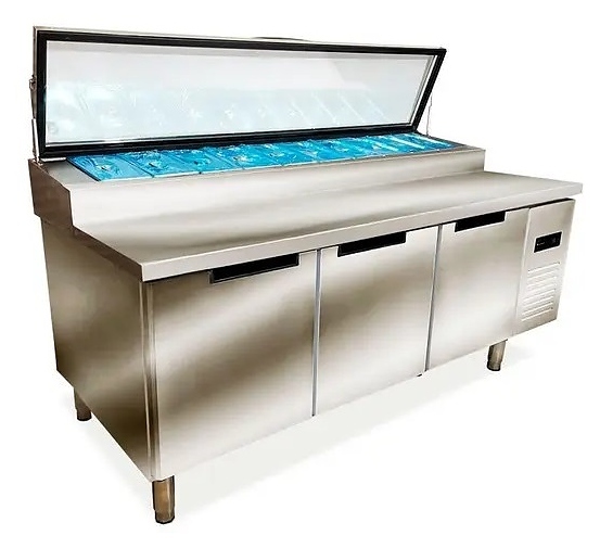 Холодильный стол для пиццы CLSY Saladetta 200 предназначен для обработки ингредиентов в процессе приготовления блюд, а также кратковременного хранения скоропортящихся продуктов и напитков на предприятиях общественного питания и торговли. Модель оснащена салат-баром (саладетта) с прозрачной крышкой, который можно использовать для приготовления пиццы, шаурмы, салатов и др., а также удобной и простой в использовании электронной панелью управления, тремя распашными дверями с доводчиками и одним рядом полок. Гастроемкости идут в комплекте. Корпус и столешница выполнены из нержавеющей стали марки AISI 201.