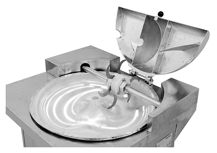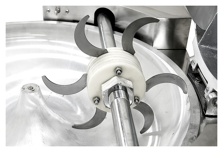 - Чаша вращается в горизонтальной плоскости перпендикулярно плоскости вращения 6-лопастного серповидного ножа