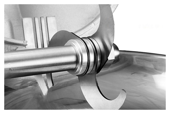 - Чаша вращается перпендикулярно плоскости вращения 3-лопастного серповидного ножа