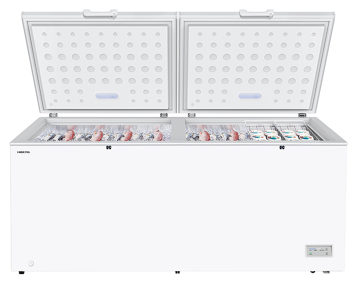 Морозильный ларь Hiberg PF 79L2W предназначен для охлаждения, заморозки, кратковременного и длительного хранения пищевых продуктов и напитков в гостиничных комплексах, офисах и домашних условиях. Модель оснащена 2 горизонтально ориентированными рабочими камерами с откидными дверьми сверху, расположенной на внешней фронтальной стенке электронной панелью управления с функциональными клавишами и светодиодными индикаторами. Корпус выполнен из металла с антикоррозийным покрытием белого цвета, внутренняя облицовка камер с серебристой поверхностью, корзины – из металла с белым антикоррозийным покрытием.