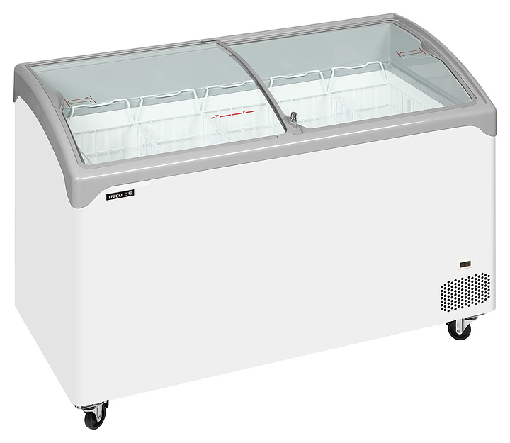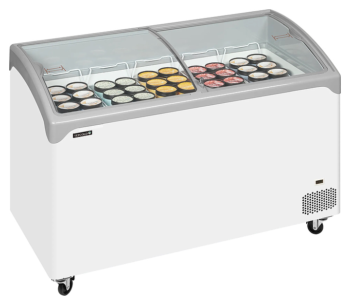 Морозильный ларь TEFCOLD NIC401SCEB предназначен для заморозки и длительного хранения продуктов и полуфабрикатов на предприятиях общественного питания и торговли. Модель оснащена 2 гнутыми раздвижными стеклянными крышками, 5 корзинами-сетками, замком, механическим контроллером, термометром, 4 колесами, 2 из которых снабжены стопорами. Внутренняя обшивка выполнена из оцинкованной стали, окрашенной белой порошковой краской.