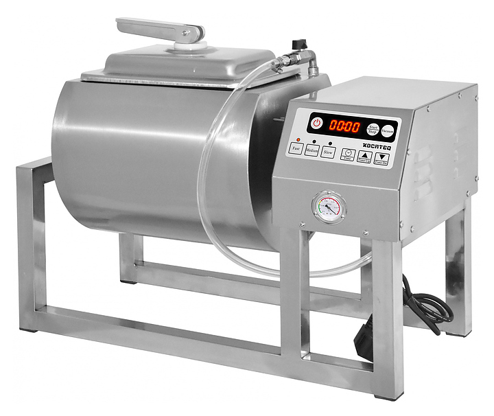 Маринатор Kocateq M 18 Eco Vac используется на предприятиях общественного питания и торговли для быстрого маринования различных видов мяса, птицы и рыбы в автоматическом режиме, за счёт вакуума в барабане структура продукта раскрывается, что позволяет маринаду и специям лучше проникать внутрь. Модель оснащена электронной панелью управления, кнопкой включения, электронным дисплеем для отображения времени работы, кнопкой старт/стоп и кнопками для переключения скоростей, кнопкой вакуумирования. Корпус выполнен из нержавеющей стали Aisi 201, бункер - из нержавеющей стали Aisi304.