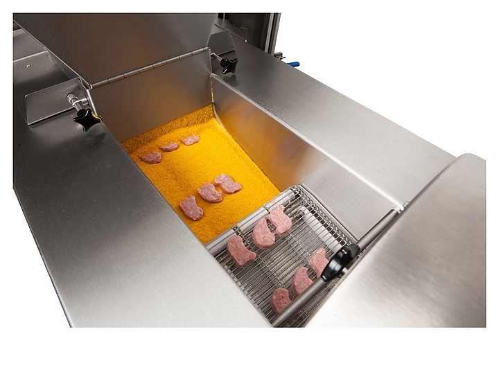 Продукт транспортируется сетчатым конвейером и переносится на нижний слой панировки. Далее продукт посыпается панировкой из верхнего бункера. Толщина верхнего слоя регулируется вручную. Избытки панировки сдуваются вентилятором и вновь возвращаются в систему циркуляции.