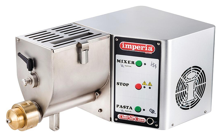 Машина для производства макаронных изделий Imperia Chef in Casa 750 используется на предприятиях общественного питания. Модель оснащена вентилятором для принудительного охлаждения двигателя и редуктора. Корпус выполнен из полированного алюминия, компоненты, контактирующие с тестом - из нержавеющей стали AISI 304, фильеры - из бронзы.