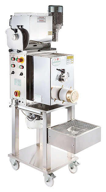 Машина для производства макаронных изделий La Monferrina P12 используется на предприятиях общественного питания. Модель оснащена вентилятором для принудительного охлаждения двигателя и редуктора. Корпус выполнен из анодированного алюминия, компоненты, контактирующие с тестом - из нержавеющей стали, фильера - из бронзы.