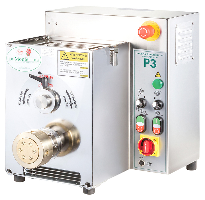 Машина для производства макаронных изделий La Monferrina P3 используется на предприятиях общественного питания. Модель оснащена вентилятором для принудительного охлаждения двигателя и редуктора. Корпус выполнен из анодированного алюминия, компоненты, контактирующие с тестом - из нержавеющей стали, фильера - из бронзы.