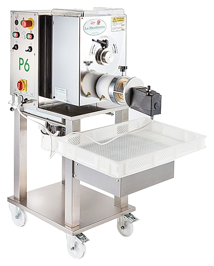Машина для производства макаронных изделий La Monferrina P6 используется на предприятиях общественного питания. Модель оснащена вентилятором для принудительного охлаждения двигателя и редуктора. Корпус выполнен из анодированного алюминия, компоненты, контактирующие с тестом - из нержавеющей стали, фильера - из бронзы.