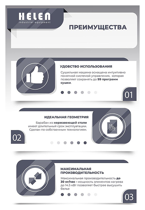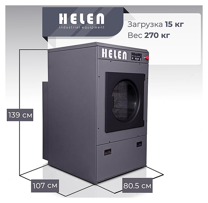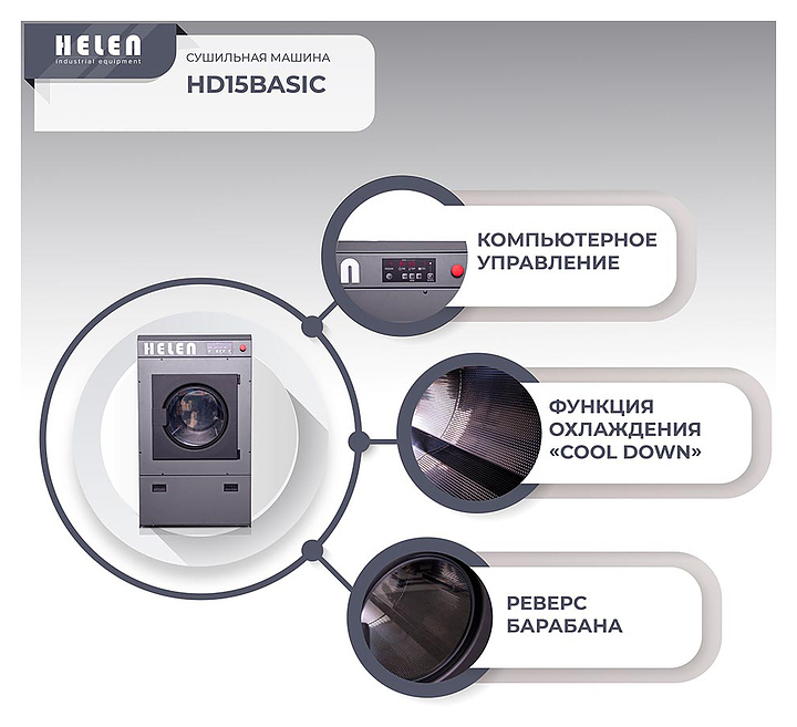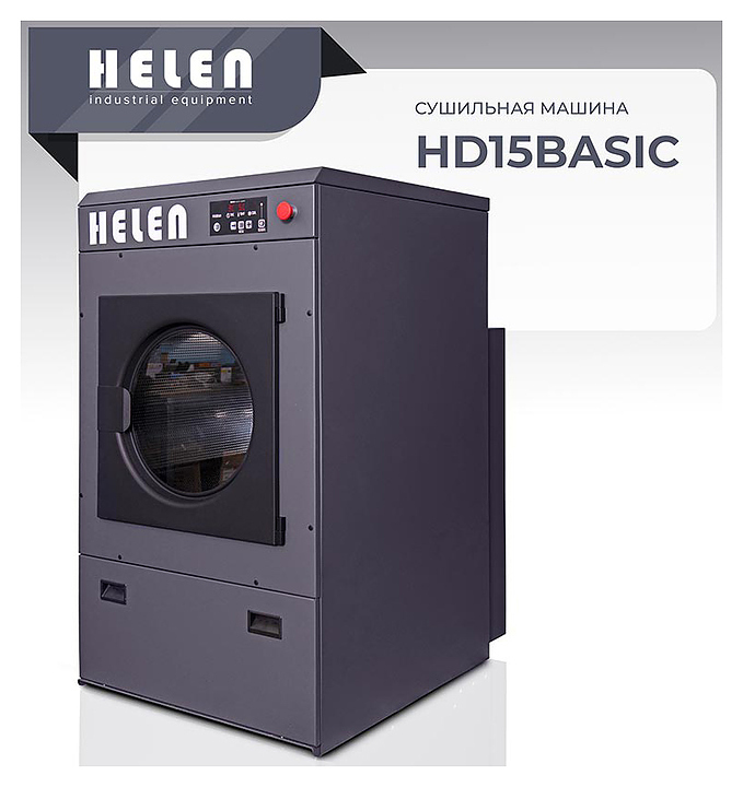 Сушильная машина HELEN HD 15 Basic используется в прачечных, гостиницах, салонах красоты, больницах и детских учреждениях для сушки различного белья и одежды с относительной влажностью до 50%. Модель оснащена встроенным вентилятором и фильтром очистки воздуха большой площади с системой диагностики засорения. Барабан выполнен из нержавеющей стали.