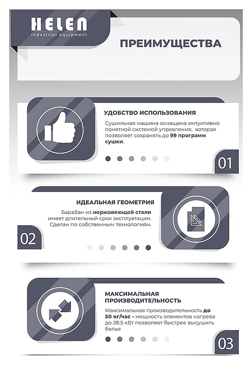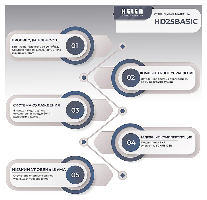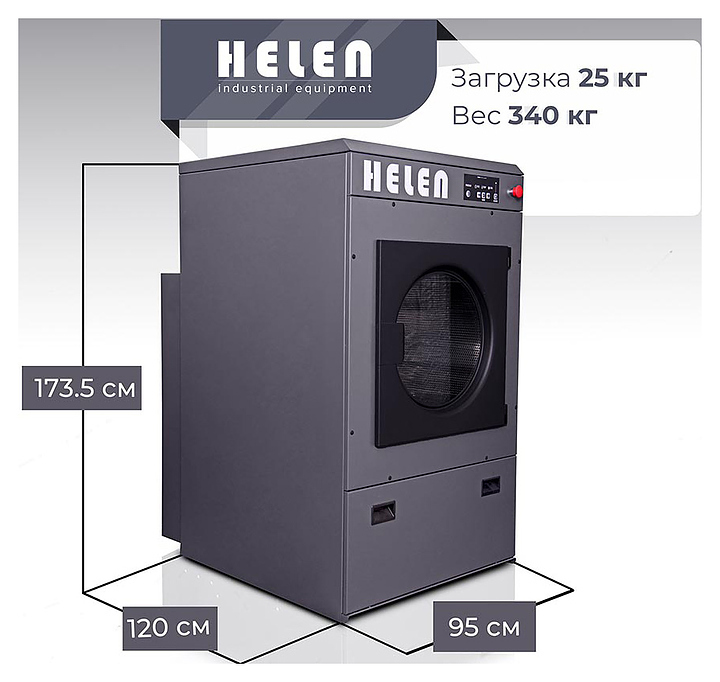 Сушильная машина HELEN HD 25 Basic используется в прачечных, гостиницах, салонах красоты, больницах и детских учреждениях для сушки различного белья и одежды с относительной влажностью до 50%. Модель оснащена микропроцессорной системой управления. Барабан выполнен из нержавеющей стали.