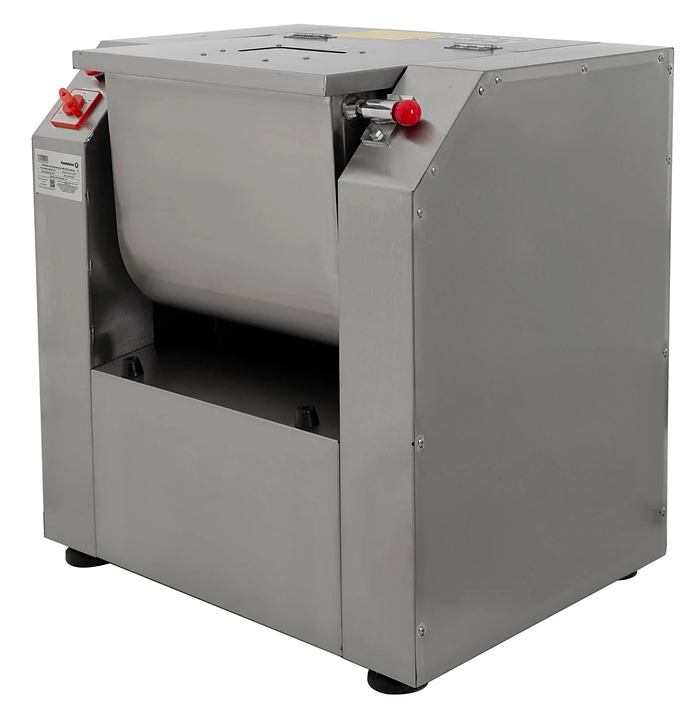 Тестомесильная машина Foodatlas DM-15 предназначена для замешивания крутого теста для приготовления пельменей, вареников, мантов и чебуреков в пекарнях, кулинарных студиях, столовых и на других предприятиях общественного питания и торговли малой и средней мощности. Модель оснащена горизонтально расположенным месильным органом с 2 S-образными лопастями и электромеханической панелью управления. Корпус выполнен из стали с антикоррозийным покрытием, дежа и месильный орган – из высококачественной нержавеющей стали, прочие соприкасающиеся с продуктом компоненты – из безопасных для пищевой продукции материалов, смотровое окно – из оргстекла, упаковка – фанерный ящик.