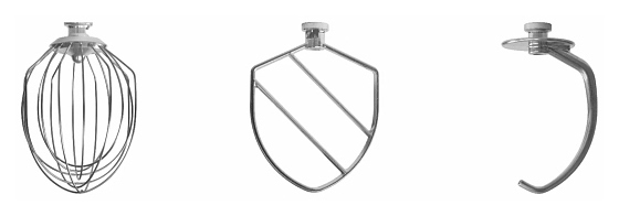 В комплект поставки входят 3 насадки: венчик, крюк и лопатка.