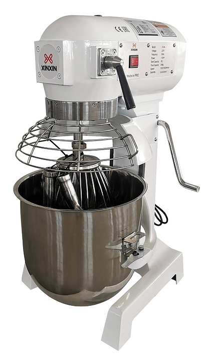 Планетарный миксер XINXIN B 30N предназначен для замеса различного вида теста как жидкой, так и плотной консистенции, взбивания крема, сливок, яичного белка и яиц, а также для приготовления различных соусов и пюре. на предприятиях общественного питания и торговли, в пекарнях и кондитерских. Вращение насадок вокруг своей оси и вдоль поверхности дежи обеспечивает высокую производительность, воздушность и однородность смеси. Модель оснащена механизмом постоянного крутящего момента с бесступенчатым изменением скорости. Дежа, решетка и насадки выполнены из нержавеющей стали, корпус - из крашеного металла.