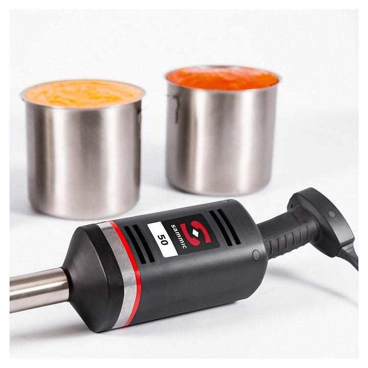 Ручной миксер Sammic MB-51 предназначен для взбивания, смешивания, измельчения продуктов питания на предприятиях общественного питания и торговли. Модель оснащена 2 насадками, регулятором скорости, двухцветным световым индикатором, указывающим состояние аппарата и эргономичной противоскользящей ручкой. Y-образный нож с долговечной режущей кромкой выполнен из закаленной стали.
