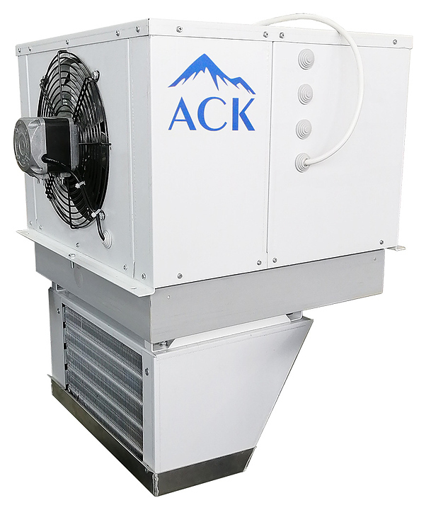 Низкотемпературный потолочный моноблок АСК-Холод МНп-32 предназначен для поддержания необходимого температурного режима в холодильных камерах на предприятиях пищевой промышленности, общественного питания и торговли. Модель выполнена в виде единого блока, воздухоохладитель (испаритель) которого устанавливается во внутренний объем холодильной камеры, а компрессорно-конденсаторный блок - снаружи. Корпус изготовлен из оцинкованной стали белого цвета толщиной от 0,9 до 1,2 мм с полимерным покрытием, трубы конденсатора и испарителя - из меди, ребра - из алюминиевого сплава.