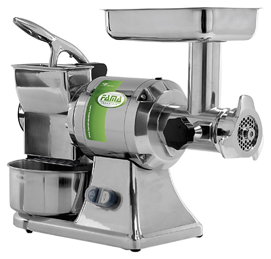 Мясорубка-терка Fama TG 12 FTG 127E используется на предприятиях общественного питания и торговли для измельчения мяса и рыбы на фарш, для натирания твёрдых сыров, сухарей или орехов. Корпус выполнен из литого под давлением алюминиевого сплава, лоток, воронка и цилиндрический вал насадки-терки - из нержавеющей стали, шнек - из сплава никеля.