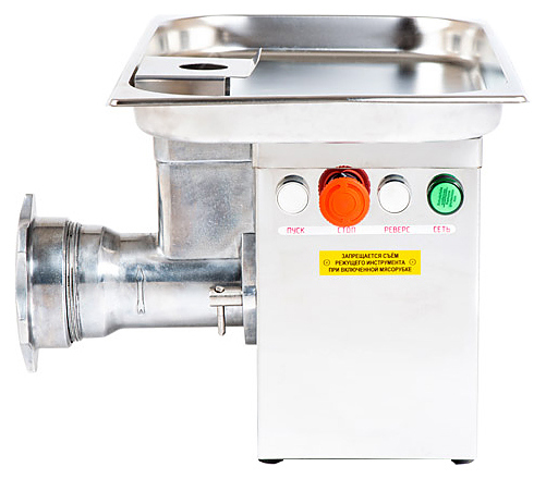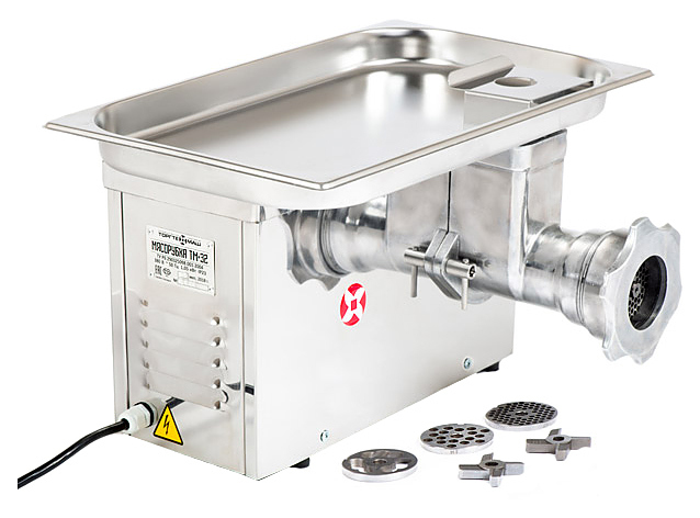 Мясорубка ТОРГТЕХМАШ ТМ-32 используется на предприятиях общественного питания и торговли для измельчения мяса и рыбы при производстве фарша, а также повторного измельчения котлетной массы и набивки колбас. Модель оснащена бесшумным червячным редуктором, функцией Реверс, исключающей необходимость разборки мясорубки при попадании костей в горловину и наматывании жил на шнек. Все детали, контактирующие в процессе работы с продуктами, выполнены из безопасной нержавеющей стали.