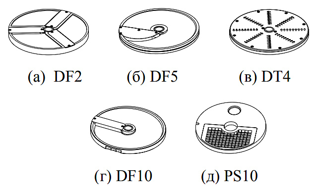 В комплект поставки входят лезвия для резки 2 и 5 мм, для шинковки 4 и10 мм и для резки кубиками 10x10x10 мм.