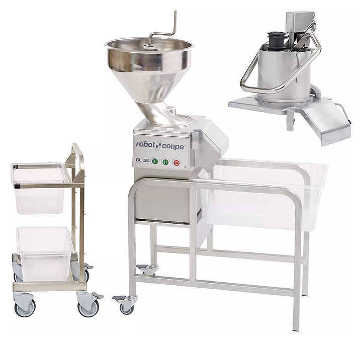 ?Овощерезка Robot Coupe CL55 используется на предприятиях общественного питания и торговли для нарезки овощей, фруктов, грибов, твердого сыра и колбас и дальнейшего использования их в качестве ингредиентов для приготовления супов, салатов, гарниров и пр. Модель оснащена 3 загрузочными отверстиями: широкой воронкой XL с рычагом для нарезки объёмных овощей (вмещает до 15 помидоров и качан капусты целиком), автоматической и цилиндрической - длинных и нежных.