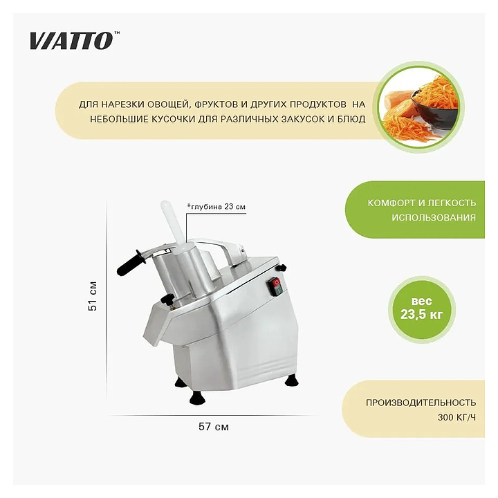 Овощерезка VIATTO HLC-300 используется на предприятиях общественного питания и торговли для нарезки сырых и вареных овощей и других продуктов. Модель оснащена крышкой с загрузочным отверстием. Ножи из нержавеющей стали.