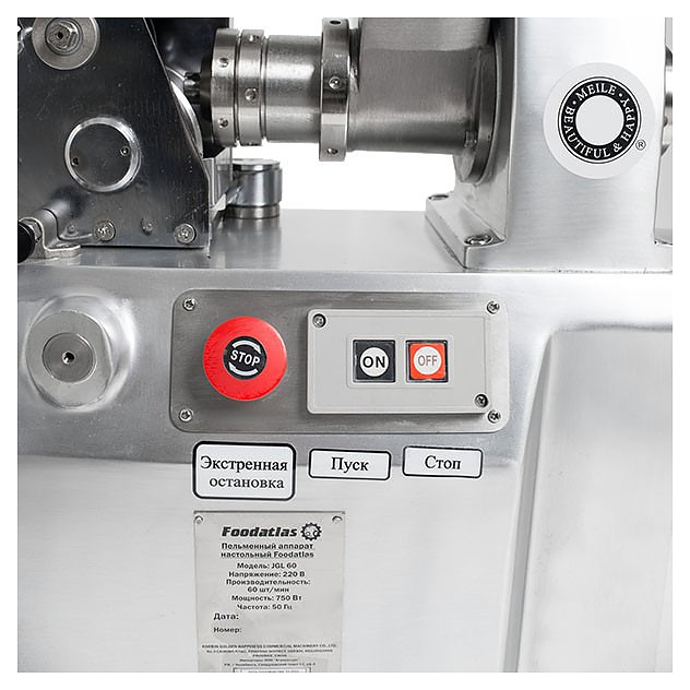 Пельменный аппарат Foodatlas JGL 60 (AR) используется на предприятиях общественного питания и торговли для производства замороженных мясных полуфабрикатов в составе пельменной линии. Модель оснащена ковшами для фарша, сухой муки и теста и рукояткой для регулирования количества начинки. Все детали, контактирующие при работе оборудования с продуктами, выполнены из нержавеющей стали.