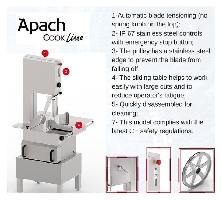 Пила Apach ASWX155A предназначена для резки мяса, птицы и рыбы на куски нужного размера на предприятиях общественного питания и торговли. Модель оснащена толкателем.