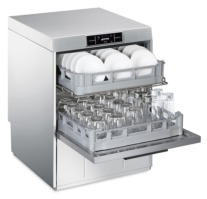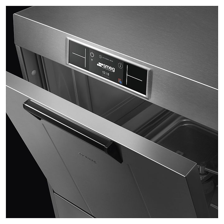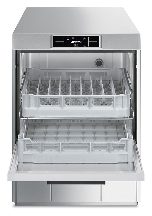 Посудомоечная машина с фронтальной загрузкой Smeg SPD522S серии PURA используется на предприятиях общественного питания и торговли для мойки столовых приборов, тарелок, стаканов, чашек в кассетах, а также гастроемкостей и другой посуды. Модель оснащена электронной панелью управления с TFT-дисплеем, дверцей с двойными стенками и уплотнителем с 3 сторон и регулируемыми по высоте ножками. Бак выполнен из нержавеющей стали AISI 304, фильтр, моющие и ополаскивающие рукава - из нержавеющей стали.