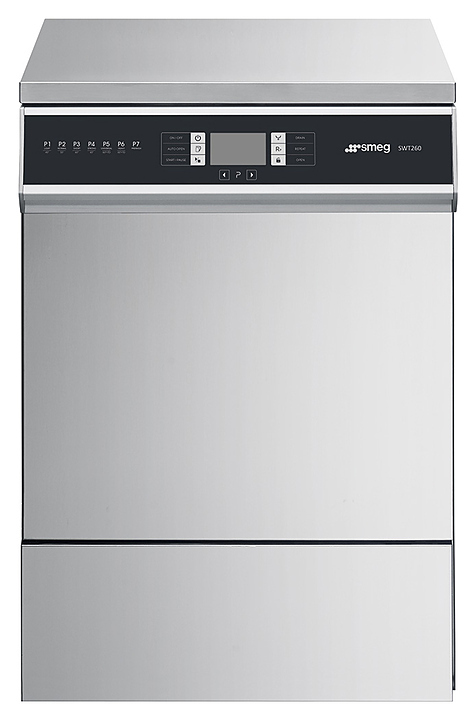 Посудомоечная машина с фронтальной загрузкой Smeg SWT264D используется на предприятиях общественного питания и торговли для мойки столовых приборов, тарелок, стаканов, чашек и другой посуды. Модель оснащена электронной панелью управления. Корпус и моющие рукава выполнены из нержавеющей стали AISI 304.