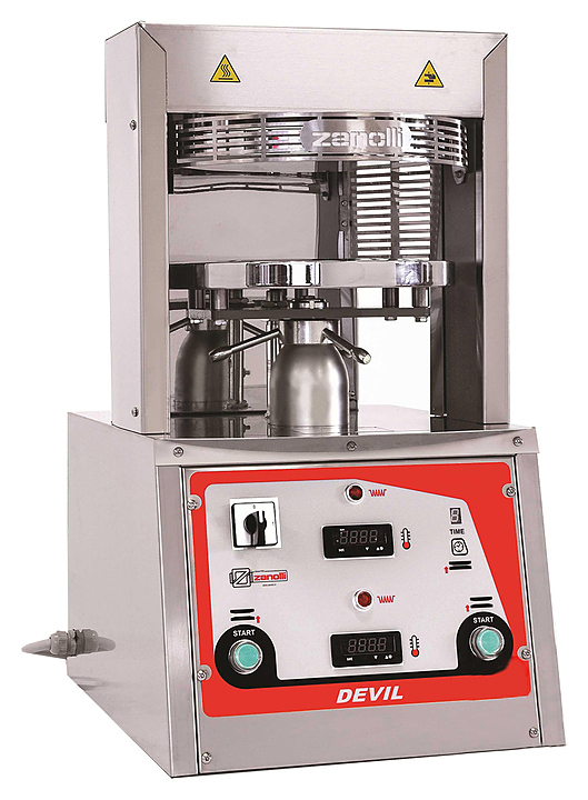 Пресс Zanolli Devil 45 используется на предприятиях общественного питания и торговли для получения круглой тестовой основы (краста). Модель оснащена 2 нагревающимися поверхностями, обеспечивающими пропекание полученных заготовок, цифровой панелью упралвения с независимыми регуляторами температуры рабочих поверхностей и таймером, и 4 резиновыми ножками. Корпус выполнен из нержавеющей стали.