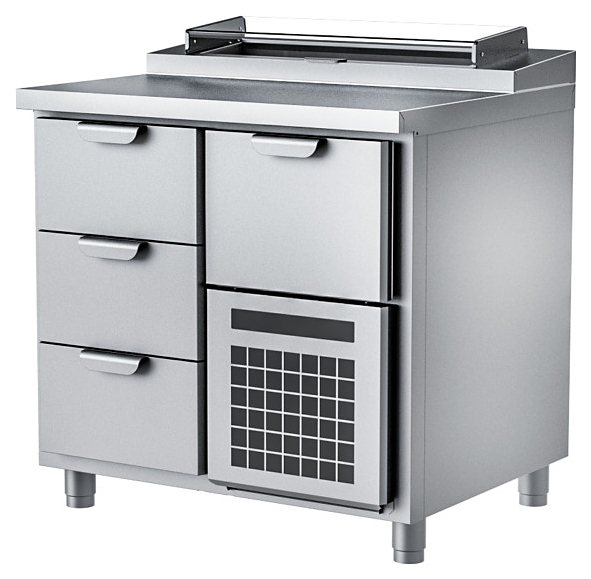 Саладетта HappyChef TC GS 3-CBR предназначена для обработки и сохранения свежести ингредиентов для холодных закусок и салатов на предприятиях общественного питания и торговли. Модель оснащена секцией справа с компрессорным холодильным агрегатом со съемной холодильной кассетой (Россия) с нижним расположением и верхним выдвижным ящиком, секцией слева с 3 выдвижными ящиками, усиленной столешницей, салат-баром с прозрачной крышкой и электронной панелью управления, ящики имеют короткие горизонтальные рукоятки в верхней части. Корпус выполнен из нержавеющей стали марки AISI 430, столешница – из нержавеющей стали марки AISI 304.