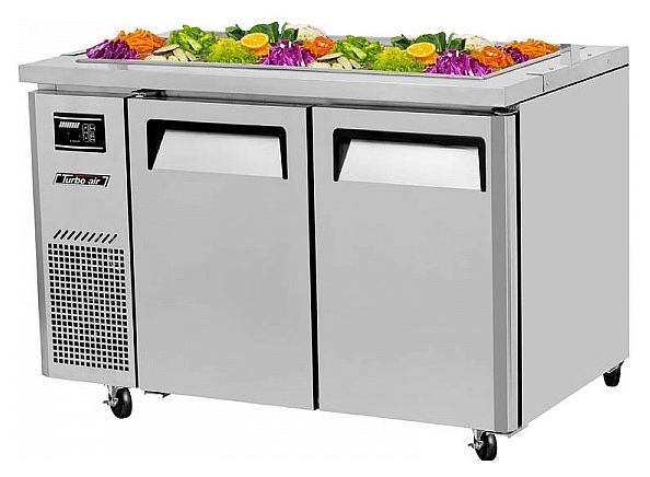 Холодильный салат-бар Turbo air KSR12-2-750 предназначен для кратковременного хранения ингредиентов для приготовления салатов на предприятиях пищевой промышленности, общественного питания и торговли. Модель оснащена 2 дверцами с эргономичными ручками, 2 регулируемыми полками и 4 колесами. Корпус выполнен из нержавеющей стали (гальванизированная сталь на оборотной стороне и внизу), пол - из нержавеющей стали с алюминиевыми вставками по бокам и сзади, дверные петли и направляющие для гастроемкостей - из высококачественной нержавеющей стали, полки - из толстой стальной проволоки с виниловым покрытием, уплотнение - из ABS-пластика.