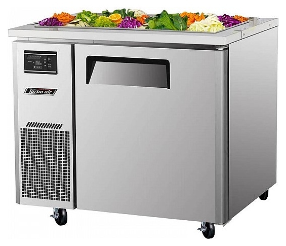 Холодильный салат-бар Turbo air KSR9-1-750 предназначен для кратковременного хранения ингредиентов для приготовления салатов на предприятиях пищевой промышленности, общественного питания и торговли. Модель оснащена дверцей с эргономичной ручкой, регулируемой полкой и 4 колесами. Корпус выполнен из нержавеющей стали (гальванизированная сталь на оборотной стороне и внизу), пол - из нержавеющей стали с алюминиевыми вставками по бокам и сзади, дверные петли и направляющие для гастроемкостей - из высококачественной нержавеющей стали, полка - из толстой стальной проволоки с виниловым покрытием, уплотнение - из ABS-пластика.