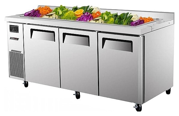 Холодильный салат-бар Turbo air KSWR18-3-700 предназначен для кратковременного хранения ингредиентов для приготовления салатов на предприятиях пищевой промышленности, общественного питания и торговли. Модель оснащена 3 дверцами с эргономичными ручками, 3 регулируемыми полками и 6 колесами. Корпус выполнен из нержавеющей стали (гальванизированная сталь на оборотной стороне и внизу), пол - из нержавеющей стали с алюминиевыми вставками по бокам и сзади, дверные петли и направляющие для гастроемкостей - из высококачественной нержавеющей стали, полки - из толстой стальной проволоки с виниловым покрытием, уплотнение - из ABS-пластика.