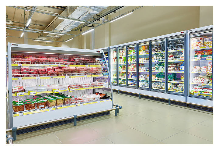 - Комбинированное решение дает возможность продемонстрировать как сыпучие товары, так и продукты в упаковке