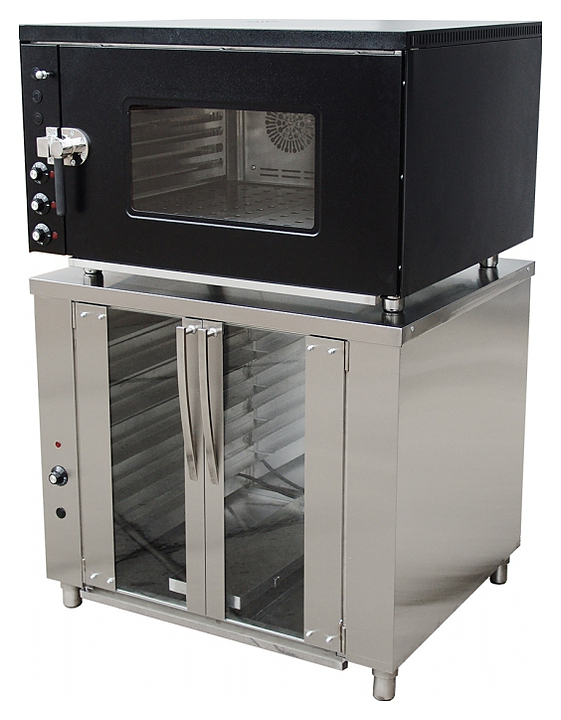 Оборудование оснащено пароувлажнением и терморегулятором. Корпус выполнен из нержавеющей стали, двери - из стекла. Основной размер противней 600х400, а также можно перенастроить под противни 530х650 и 690х450 мм.