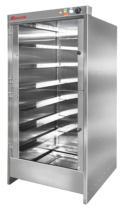 Шкаф расстоечный Восход ШР-1H используется на предприятиях общественного питания и торговли для окончательной расстойки тестовых заготовок хлебобулочных продуктов, кондитерских изделий (круассанов, рогаликов, бубликов, булочек, пирожных) и пиццы на подовых листах и в хлебных формах. Модель оснащена 6 направляющими для подовых листов и хлебных форм. Шкаф изготовлен из нержавеющей стали.