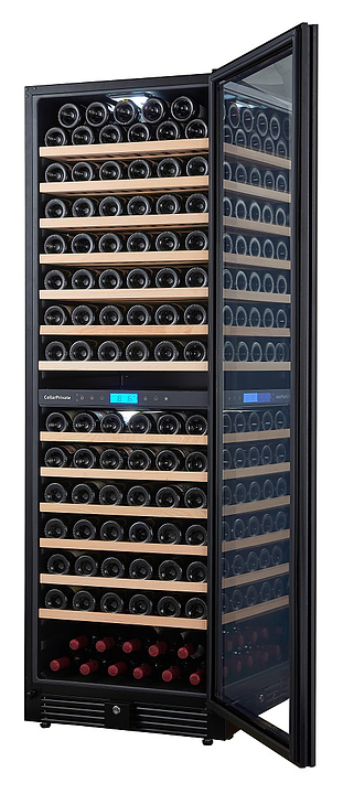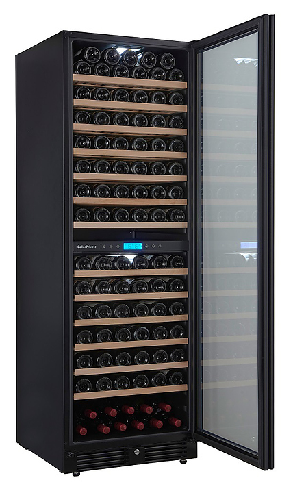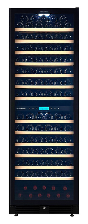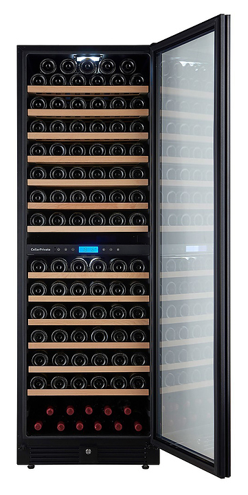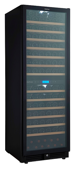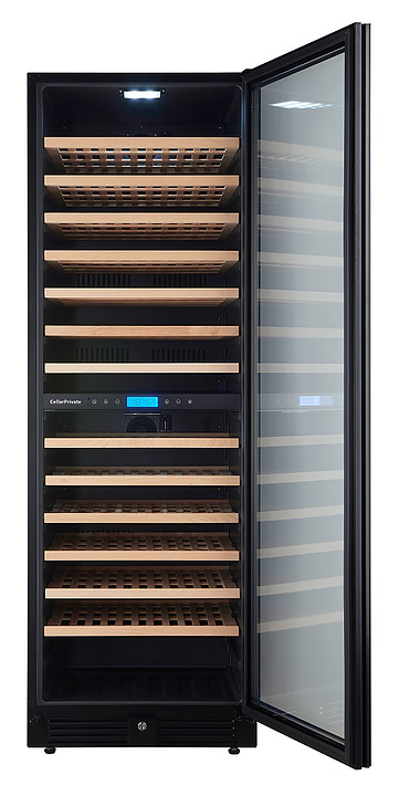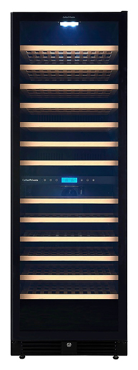 Винный шкаф Cellar Private CP165-2TBH предназначен для хранения бутилированного вина различных сортов в барах, ресторанах, специализированных магазинах, подсобных складских помещениях, а также в домашних условиях. Модель оснащена сенсорной панелью управления, которая находится внутри шкафа за дверцей, цифровым дисплеем для отображения температуры в камере и 13 съемными полками. Корпус выполнен из окрашенного металла, дверь - из металла, пластика и двойного стекла с защитой от УФ-излучения, полки - из дерева.