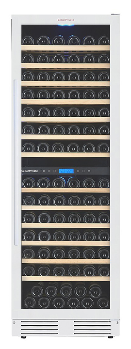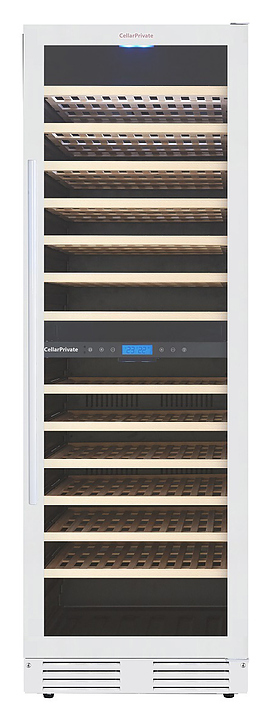 Винный шкаф Cellar Private CP165-2TW предназначен для хранения бутилированного вина различных сортов в барах, ресторанах, специализированных магазинах, подсобных складских помещениях, а также в домашних условиях. Модель оснащена сенсорной панелью управления, которая находится внутри шкафа за дверцей, цифровым дисплеем для отображения температуры в камере и 13 съемными полками. Корпус выполнен из окрашенного металла, дверь - из металла, пластика и двойного стекла с защитой от УФ-излучения, полки - из дерева, ручка двери - из металла.