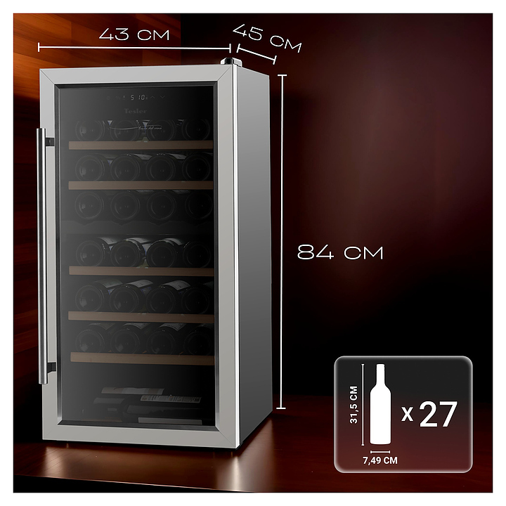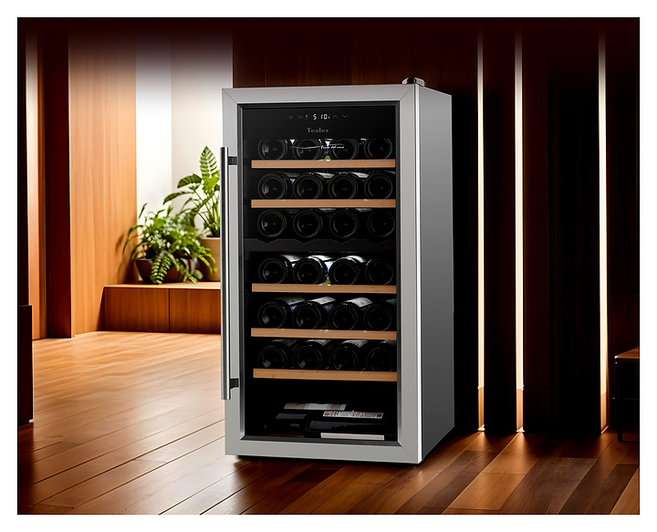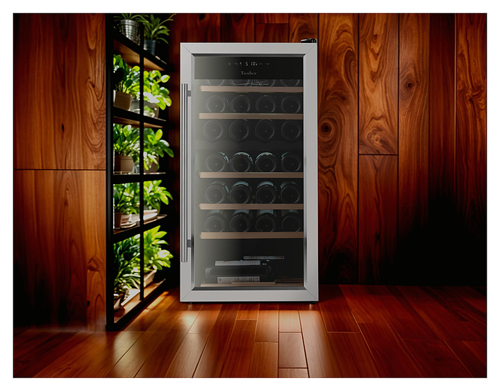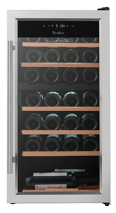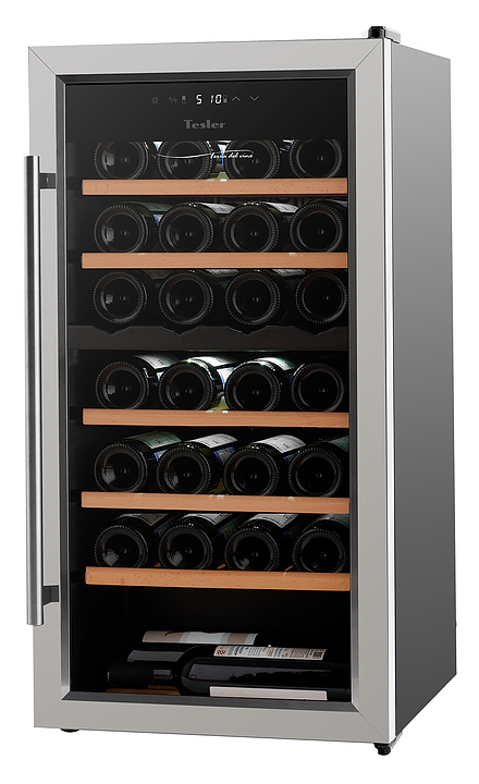 Винный шкаф TESLER CWC-300 предназначен для охлаждения, хранения при оптимальных условиях и демонстрации бутилированного вина различных сортов в барах, ресторанах, специализированных магазинах, подсобных складских помещениях, а также в домашних условиях. Модель оснащена холодильной камерой с 5 полками и 1 подставкой, удобной ручкой, дисплеем, распашной дверью и электронным управлением. Полки и подставка выполнены из дерева, дверца - из двойного стекла с зеркальной поверхностью, рамка - из нержавеющей стали.