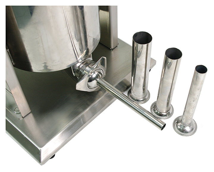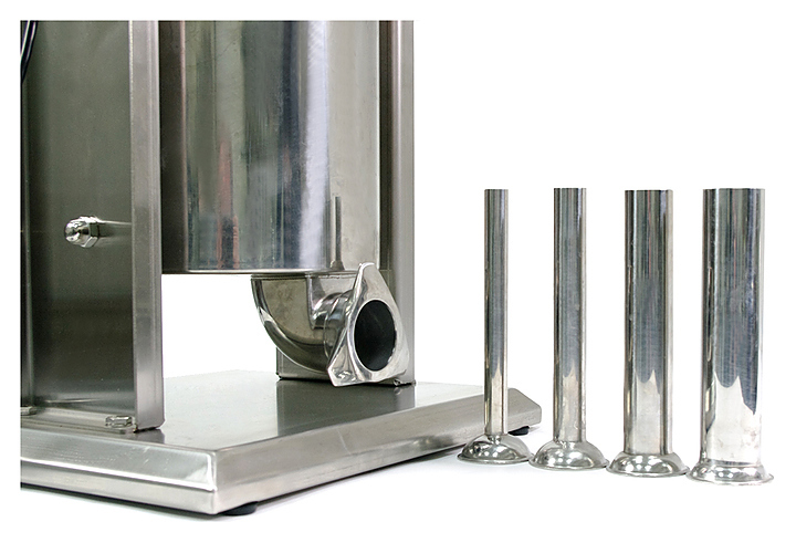В комплект поставки вxодят 3 воронки-цевки из нержавеющей стали с входным диаметром 22, 32, 38 мм и ножная педаль.