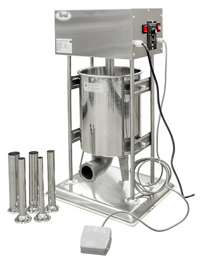 Колбасный шприц Roal Meat DD10L используется на предприятиях общественного питания и торговли для изготовления колбас, сосисок и сарделек, а также набивки паштетов, творожных масс и других плотных вязких продуктов. Модель оснащена ножной педалью. Корпус выполнен из пищевой нержавеющей стали AISI 304.
