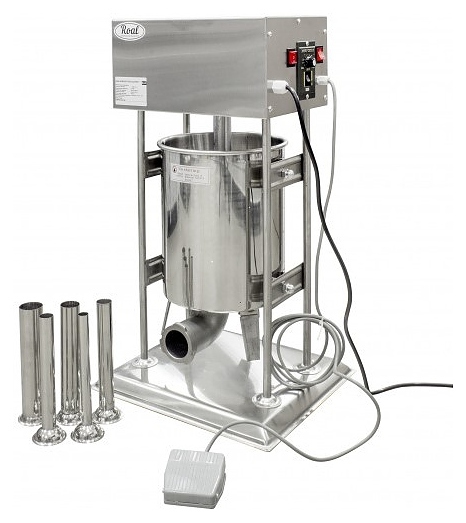 Колбасный шприц Roal Meat DD15L используется на предприятиях пищевой промышленности при производстве колбасных изделий и аналогичных продуктов для наполнения начинкой подготовленных оболочек. Модель оснащена электромеханической панелью управления. Корпус и насадки выполнены из высококачественной нержавеющей стали.