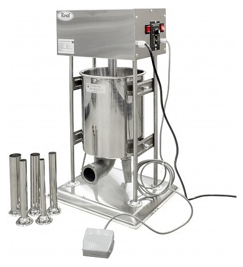Колбасный шприц Roal DD25L используется на предприятиях общественного питания и торговли для изготовления колбас, сосисок и сарделек, а также набивки паштетов, творожных масс и других плотных вязких продуктов. Модель оснащена ножной педалью. Корпус выполнен из пищевой нержавеющей стали.