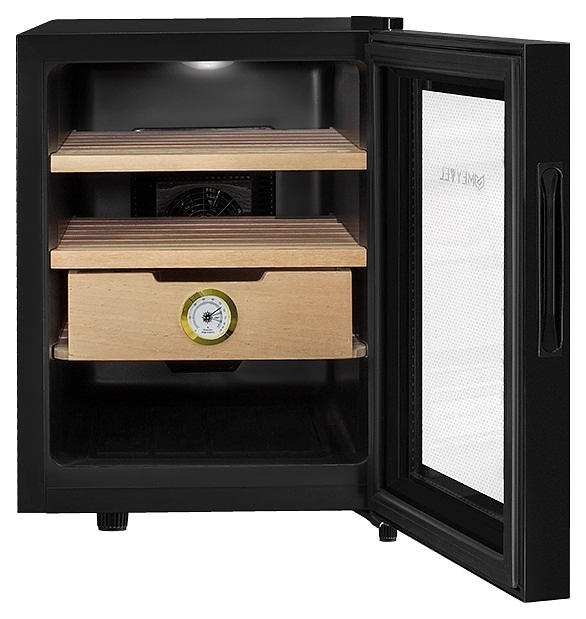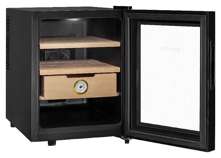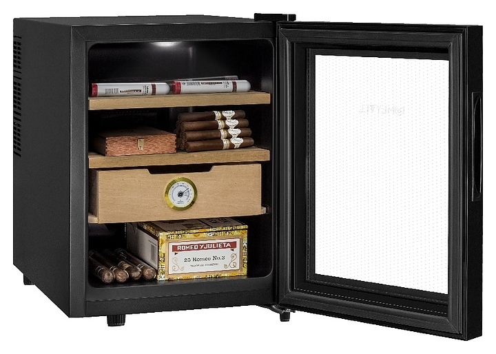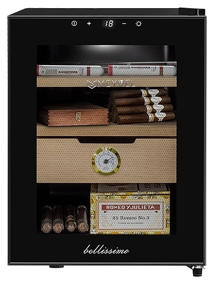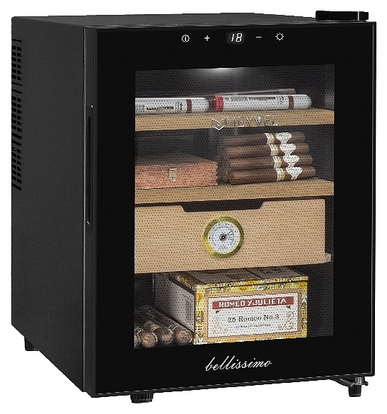 Сигарный шкаф MEYVEL MC-33BT предназначен для хранения в оптимальных условиях и демонстрации табачных изделий в специализированных магазинах, гостиницах, складских помещениях, а также домашних условиях. Модель оснащена распашной дверью на внешних петлях и сенсорной панелью управления с цифровым дисплеем. Копрус выполнен из стали с антикоррозийным покрытием черного цвета, рама двери – из черного пластика, полки и ящик – из массива древесины испанского кедра.
