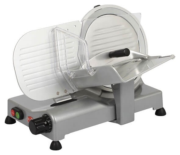 Слайсер RGV Lusso 25 G/A CEV Prof предназначен для нарезки мяса, сыров, колбасных изделий, хлеба и других гастрономических изделий на ровные ломтики на предприятиях общественного питания, торговли и пищевой промышленности. Модель оснащена наклонным дисковым ножом. Основание выполнено из алюминия, покрытого пригодной для контакта с пищевыми продуктами краской, лезвие – из закаленной шлифованной стали с твердым хромированным покрытием, крышка ножа, лоток для продуктов, перегородка для регулировки нарезки и фиксированное защитное кольцо лезвия – из анодированого алюминия с полированным покрытием, защитный экран – из плексигласа.